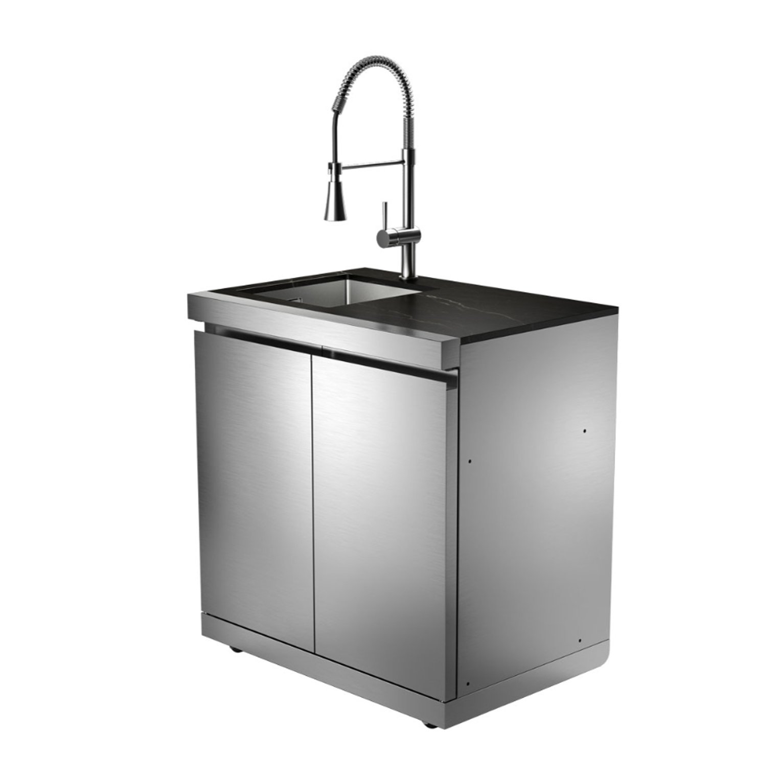 Elegantly designed with sleek black Laminam countertops, the Whistler Sink Cabinet offers ample storage space and even includes an integrated trash bin. The levelling legs make it easy to adjust the height of each unit, accommodating your patio or flooring requirements. This modular kitchen system features a fully welded handmade sink, a luxurious stainless-steel tap, and a solid stainless-steel construction. The full stainless-steel cabinet comprises two doors with three internal storage shelves, keeping all your BBQ supplies organized and within easy reach. With its user-friendly manoeuvrability and convenient 99% pre-assembled delivery, the Whistler Cirencester Sink Cabinet ensures a seamless and enjoyable outdoor cooking experience.